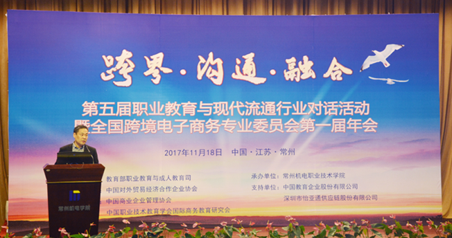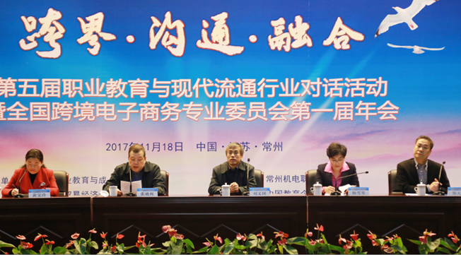 2017年11月18日,第五届职业教育与现代流通行业对话活动暨全国跨境电子商务专业委员会第一届年会在江苏常州隆重召开,来自全国近100所高职院校和国家部委,教育行政部门,教育研究机构,行业组织,企事业单位,媒体等共计200余人参加了本届对话活动。