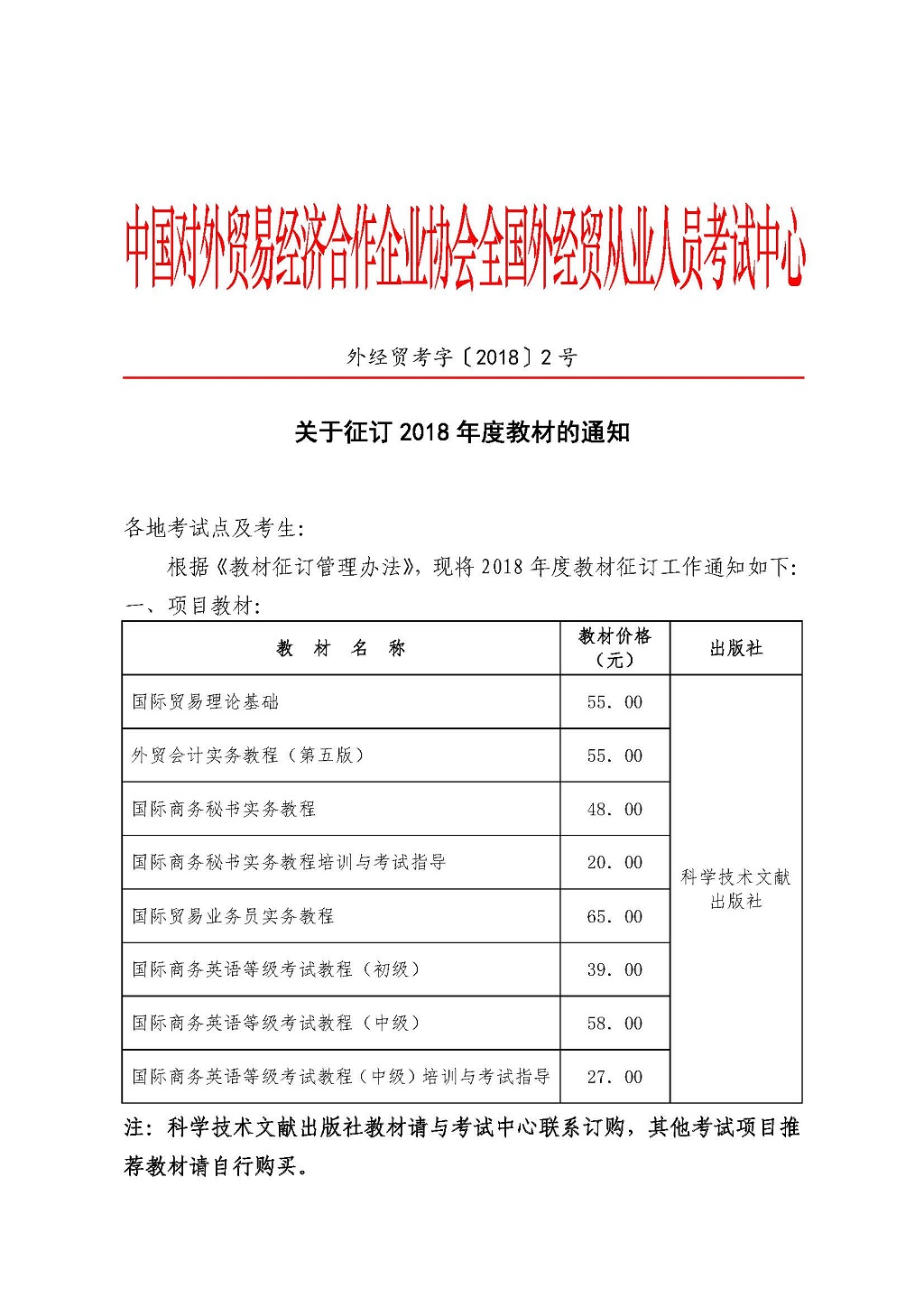 关于征订2018年度教材的通知